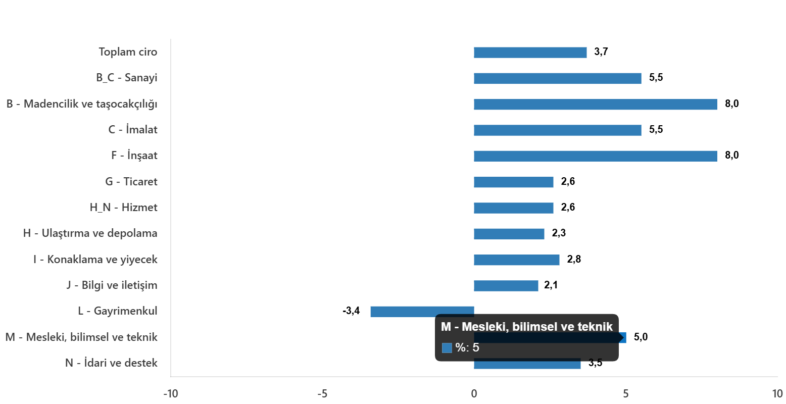 Toplam cironun alt ayrıntılarına bakıldığında; 2025 yılı Kasım ayında aylık sanayi kesimi ciro endeksi %5,5 arttı, inşaat ciro endeksi %8,0 arttı, ticaret ciro endeksi %2,6 arttı, hizmet ciro endeksi %2,6 arttı.