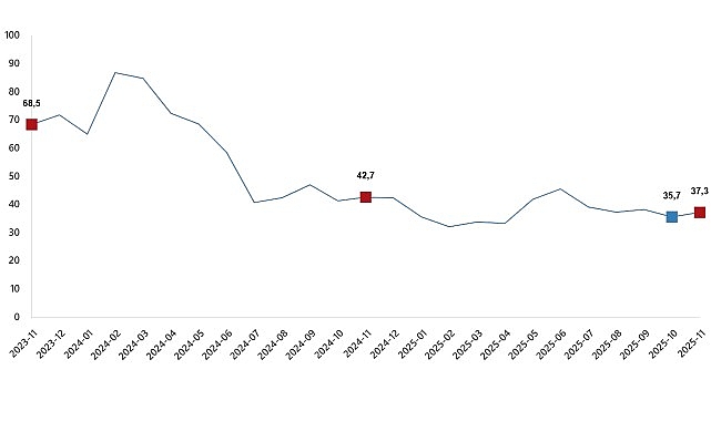 Sanayi, inşaat, ticaret ve hizmet kesimleri toplamında ciro endeksi (2021=100), 2025 yılı Kasım ayında yıllık %37,3 arttı.