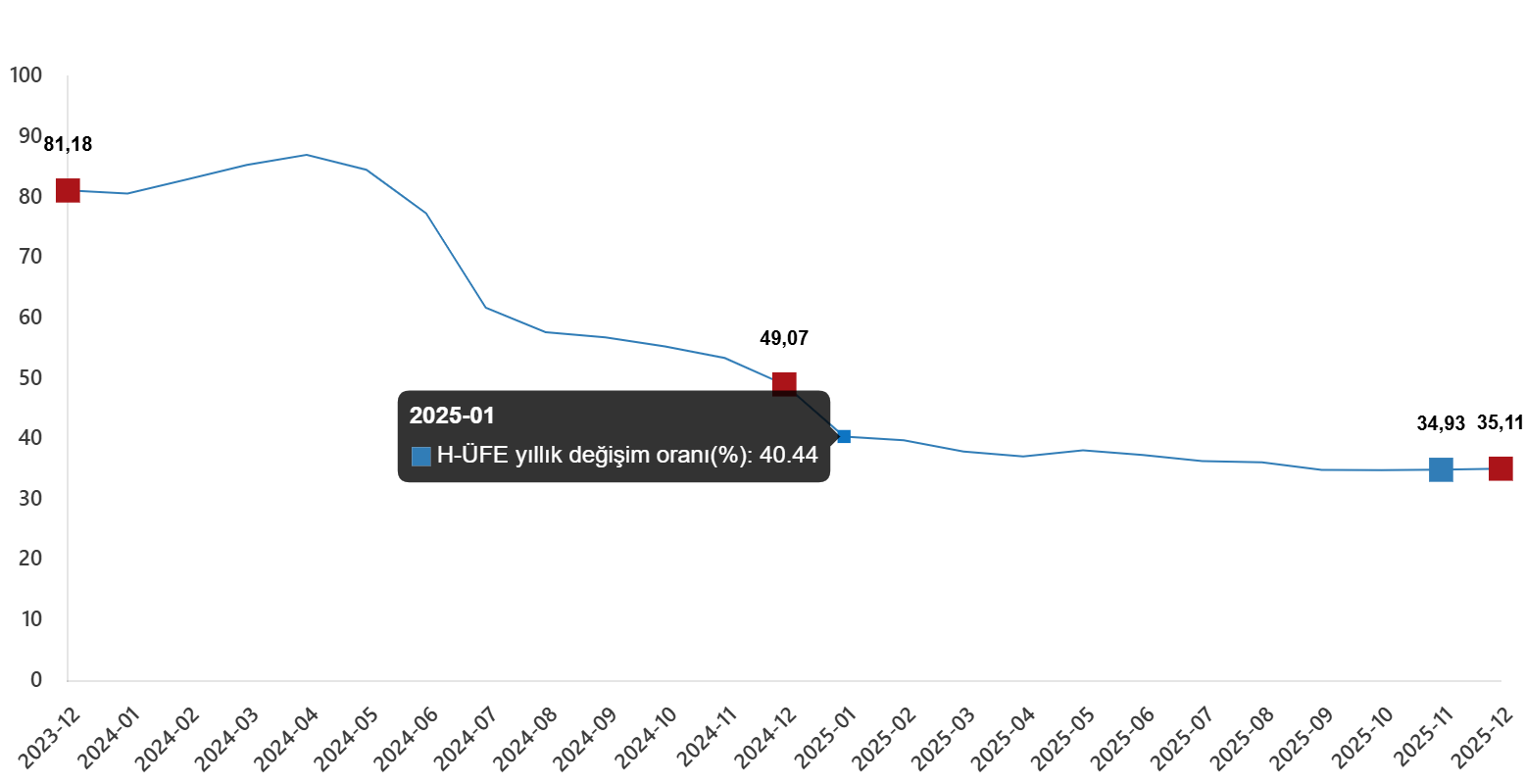 H-ÜFE 2025 yılı Aralık ayında bir evvelki aya nazaran %0,78 artış, bir evvelki yılın Aralık ayına nazaran %35,11 artış, bir evvelki yılın birebir ayına nazaran %35,11 artış ve on iki aylık ortalamalara nazaran %36,78 artış gösterdi.