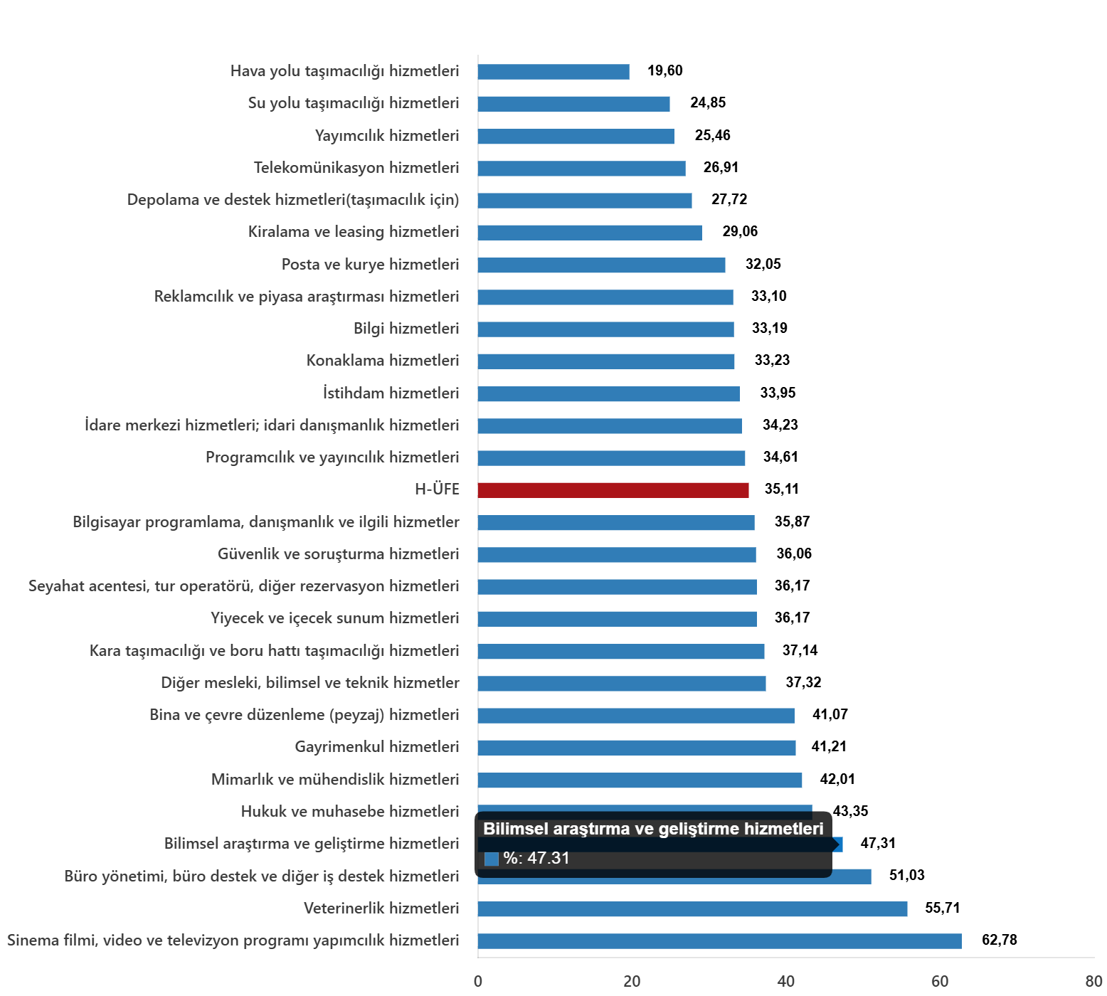 Bir evvelki yılın birebir ayına nazaran, ulaştırma ve depolama hizmetlerinde %32,32 artış, konaklama ve yiyecek hizmetlerinde %35,46 artış, bilgi ve irtibat hizmetlerinde %34,32 artış, gayrimenkul hizmetlerinde %41,21 artış, mesleksel, bilimsel ve teknik hizmetlerde %40,33 artış, idari ve takviye hizmetlerde %37,92 artış gerçekleşti.