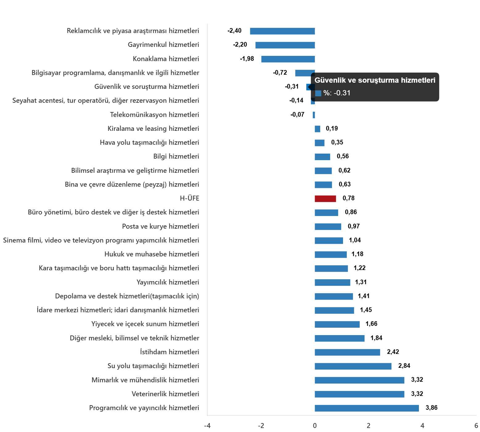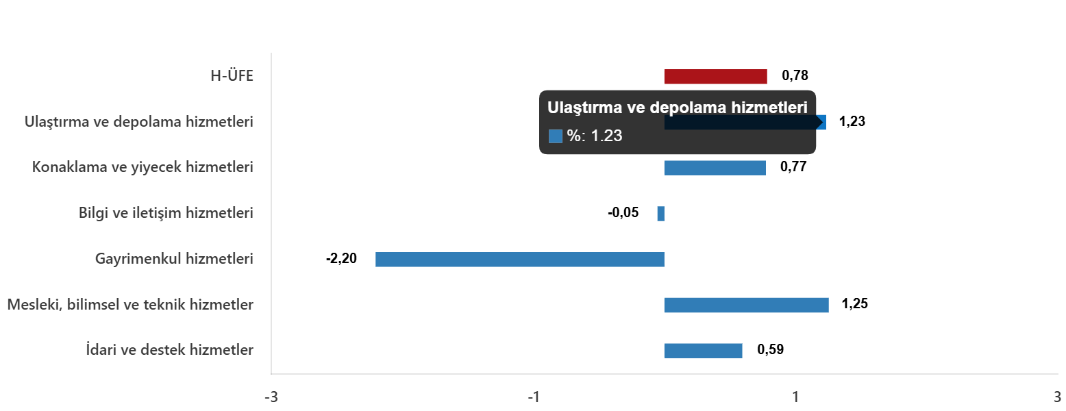 Bir evvelki aya nazaran, ulaştırma ve depolama hizmetlerinde %1,23 artış, konaklama ve yiyecek hizmetlerinde %0,77 artış, bilgi ve bağlantı hizmetlerinde %0,05 azalış, gayrimenkul hizmetlerinde %2,20 azalış, mesleksel, bilimsel ve teknik hizmetlerde %1,25 artış, idari ve dayanak hizmetlerde %0,59 artış gerçekleşti.