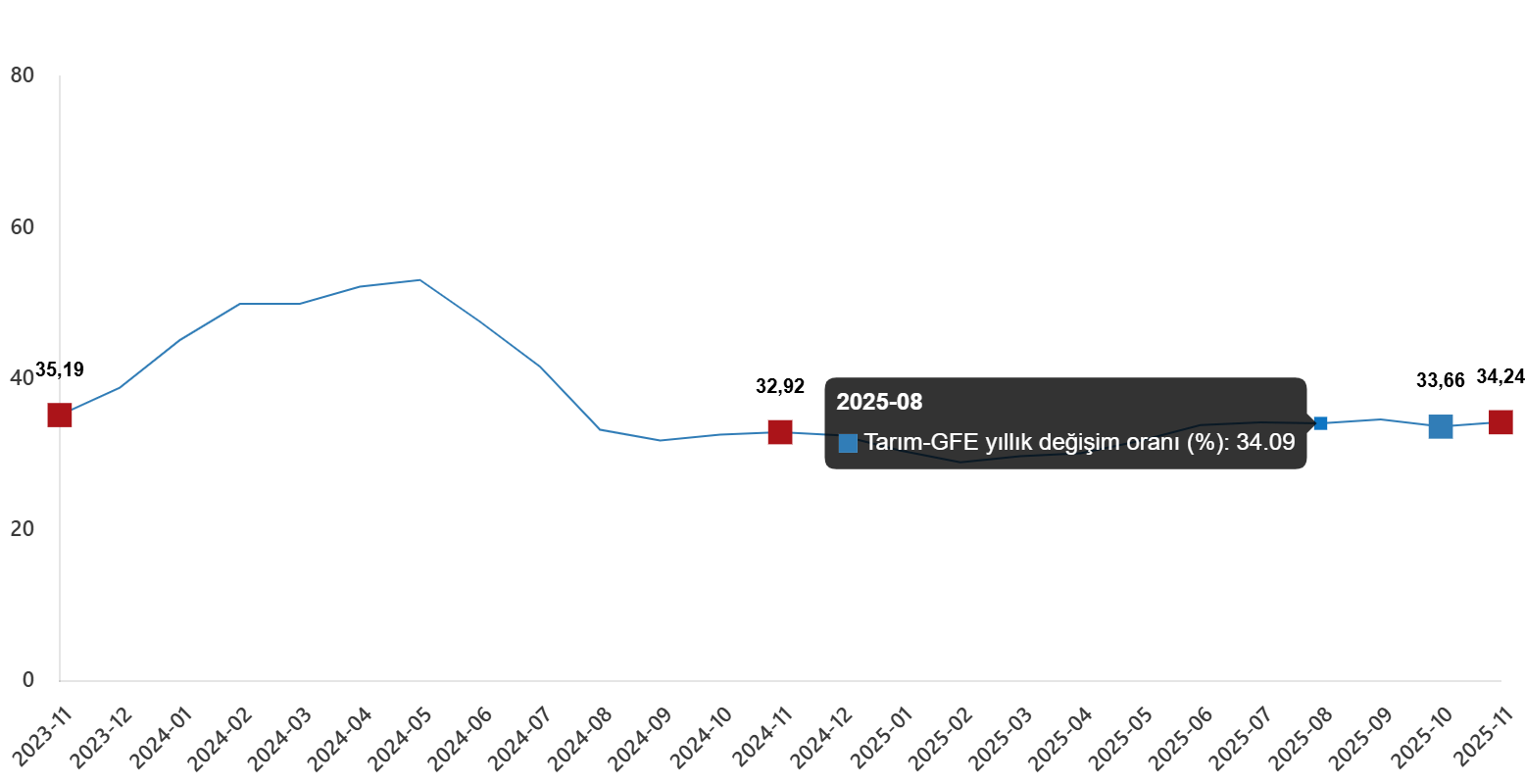 Tarım-GFE’de (2020=100), 2025 yılı Kasım ayında bir evvelki aya nazaran %1,84 artış, bir evvelki yılın Aralık ayına nazaran %31,43 artış, bir evvelki yılın birebir ayına nazaran %34,24 artış ve on iki aylık ortalamalara nazaran %32,44 artış gerçekleşti.