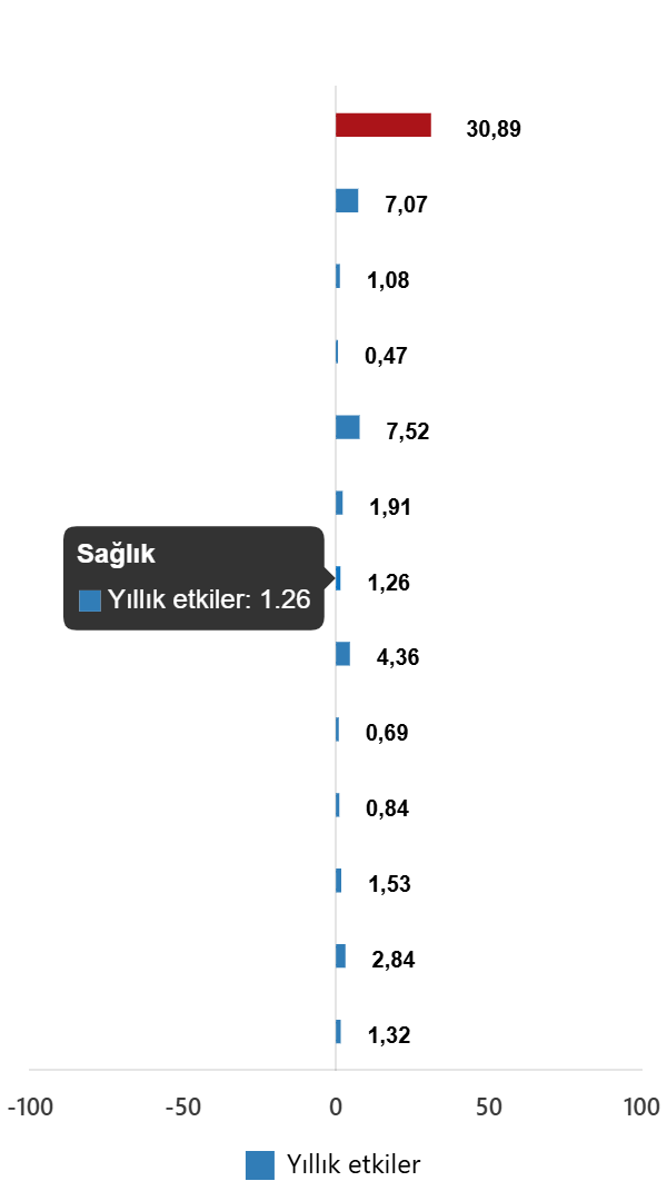 En yüksek yüke sahip 3 ana harcama kümesinin yıllık değişimleri; besin ve alkolsüz içeceklerde %28,31 artış, ulaştırmada %28,44 artış ve konutta %49,45 artış olarak gerçekleşti. İlgili ana kümelerin yıllık değişime olan tesirleri ise besin ve alkolsüz içeceklerde %7,07, ulaştırmada %4,36 ve konutta %7,52 oldu.