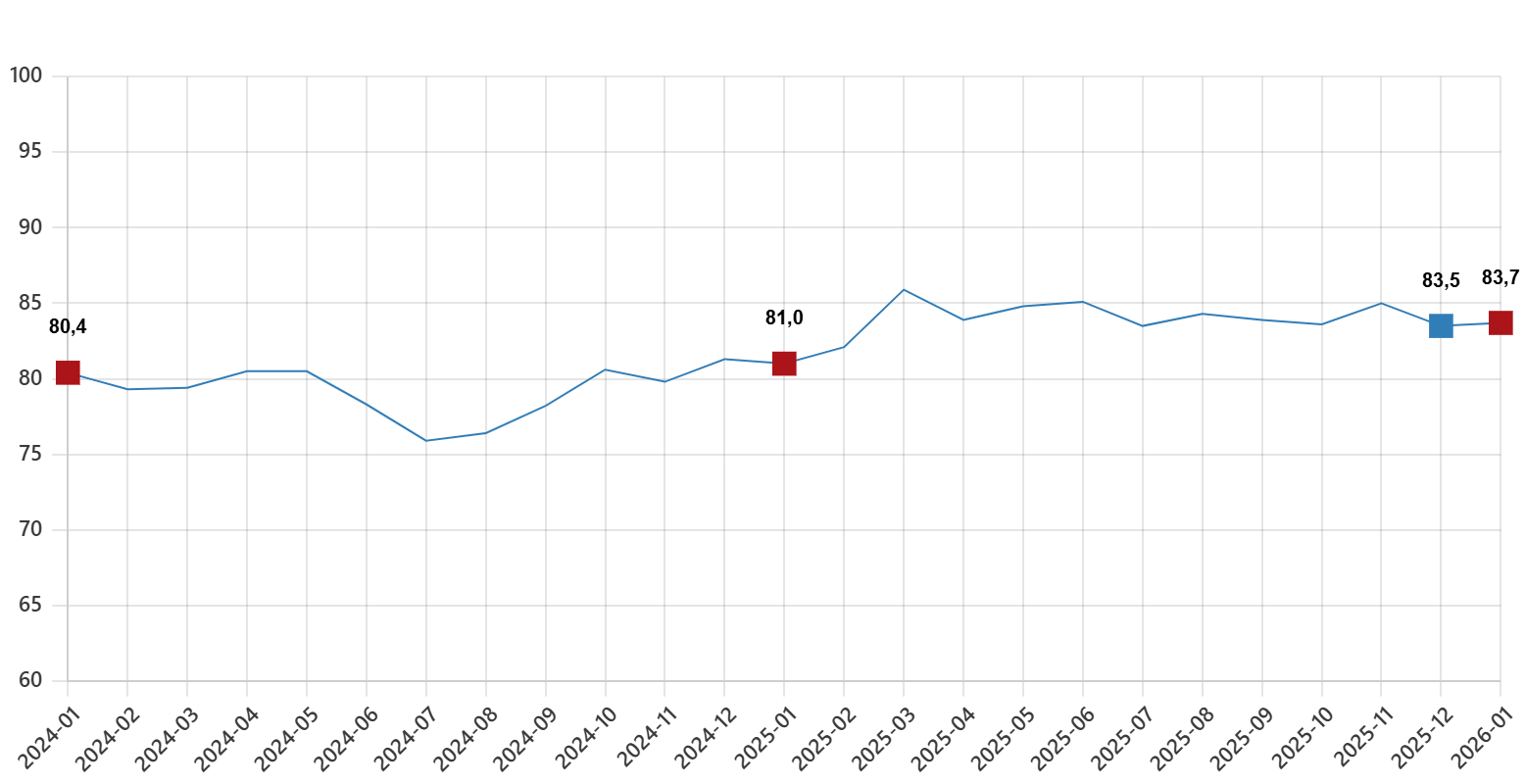 Türkiye İstatistik Kurumu ve Türkiye Cumhuriyet Merkez Bankası işbirliği ile yürütülen tüketici eğilim anketi sonuçlarından hesaplanan tüketici inanç endeksi, Aralık ayında 83,5 iken Ocak ayında %0,3 oranında artarak 83,7 oldu.
